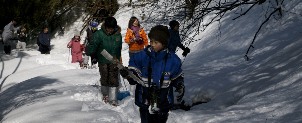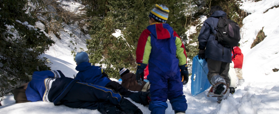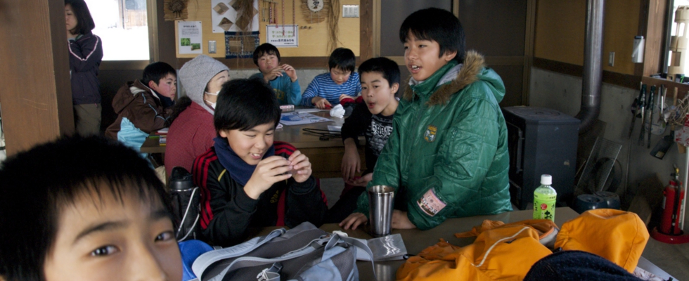 朝、体験工房に集合し、各グループごとに雪の下にどんな危険が隠れているか考えてもらいました。6月に行ったときのことも思いだしてもらい、側溝や水路、竹の切り株が見えない場所にあることを理解してもらいました。そのあと、お昼ご飯のアルファ米の作り方をみんなで確認しながら、お湯を入れて準備完了。カセットコンロや水・鍋など、3年生以上はさらにカンジキを持ち、体験工房を出発しました。
