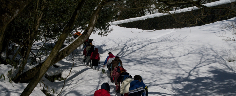 いよいよ露谷の探検に出発、先頭グループでカンジキで雪を踏み固めてね〜