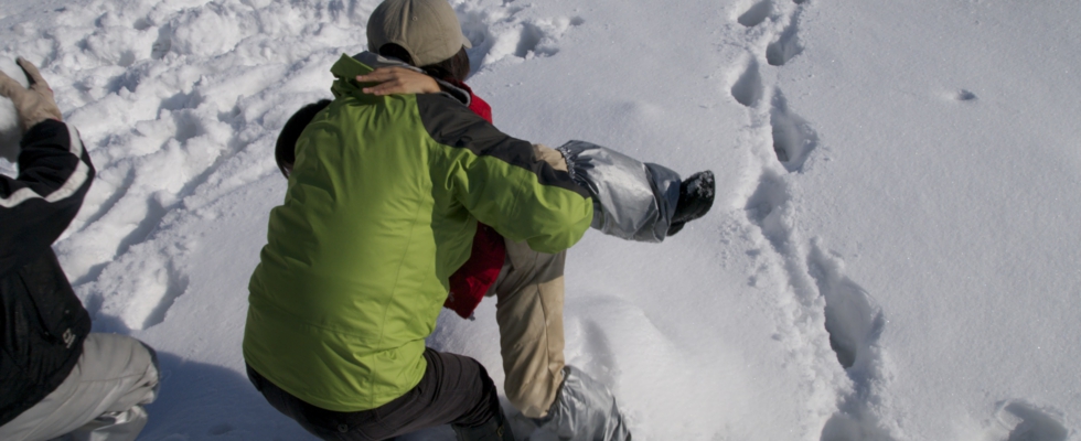 体験工房の横に露谷に降りる道がありますが、今回は雪が多くこの道は完全に埋まっているので(^_^; 駐車場からグルッと回りました。と、いってもすぐ近くのなので15分ほどで露谷の入り口に到着。さっそく、カンジキをはきますが縛り方が弱くて付け直したりと高学年生が手こずっている間に、1,2年生は長靴のまま新雪の中に飛び込んでいる〜(^_^;