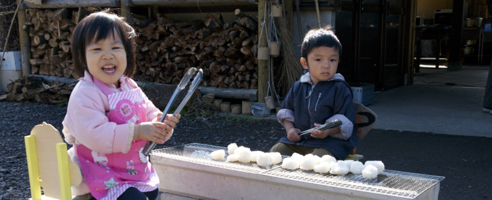 そして、なんでもやりたがるおさんぽちゃんたちは、自分で椅子を運びだし、火を囲んで座り、焼おにぎりをトングでひっくり返し、そして、しょうゆも上手にぬっていました。おさんぽちゃんの小さなバーベキューだね。