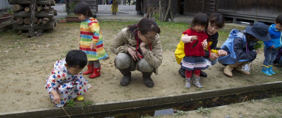 ふるさと館に到着し、みんなは、おたまじゃくし♪が大きくなったか見に行きました。