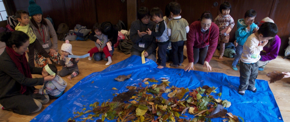 「さわさわもみじ」の絵本を見て、さぁ落ち葉で遊ぼう!