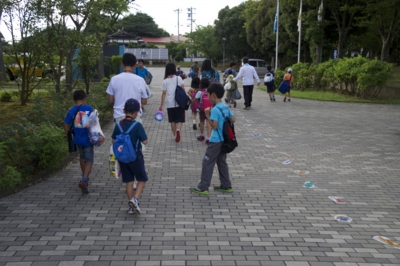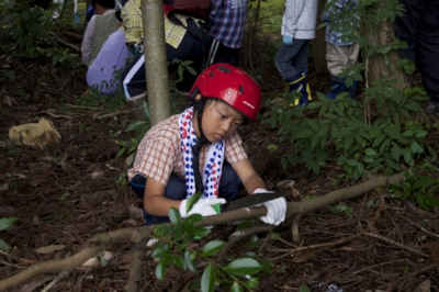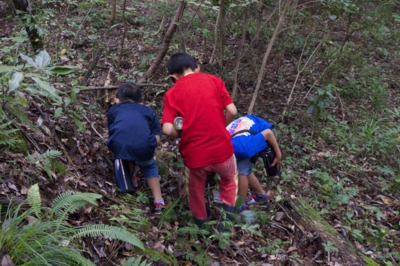 途中、雨がパラパラと落ちてきたので、アカテガニとさよなら。すこし早足でバスに向かいました。途中の坂で水筒のフタを落としてしまって、どうしよ〜 よねやんのロープワークをみんなで見学しました。 バスに着く前に、アカテガニのふり返り、スタート時にきんちゃんが話してくれてた観察のポイントをもう一度、確認しました。
