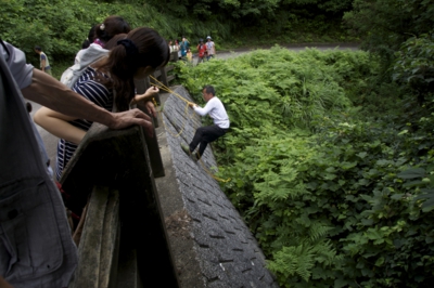 急な斜面をロープ一本で登るよねやん