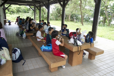ふり返りを終えて、3時ごろに出発しました。途中、休憩を挟みながら、混んではいたものの渋滞というほどでもなく、順調にバスは走り、夕日寺健民自然園に着きました(^_^) 順調すぎたので、お迎えの保護者の方よりはやく着きました(^_^;