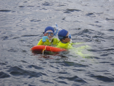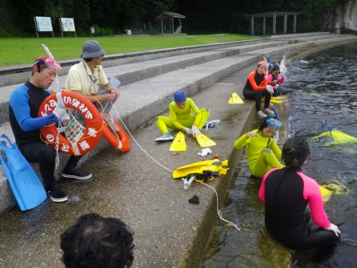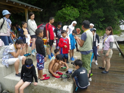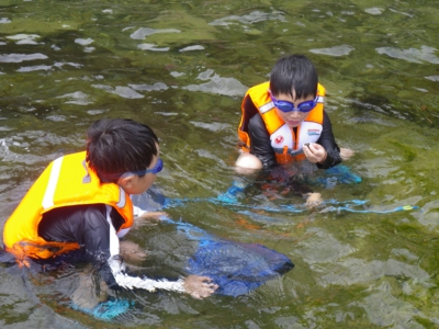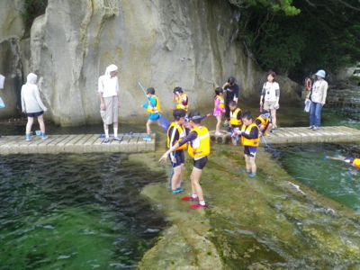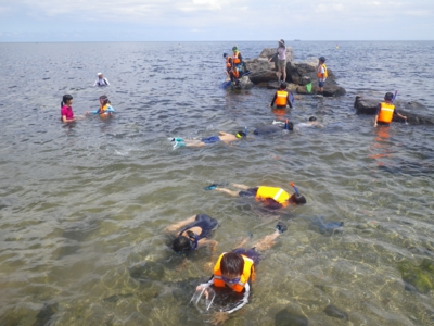 4、5年生は水中めがねやスノーケル、ウエットスーツをきてスノーケリング体験、1〜3年生は磯観察と2つのグループに分かれて活動です。 スノーケリング体験グループは、まずは海の中の危険な生物や注意事項をきいて、そのあと道具の使い方を教わりました。一方、磯観察グループも注意事項の説明を聞いて、さっそく近くの海に入りました(^_^) そのあと、浅いところ、深いところと2箇所ほど場所を変えて、磯観察を楽しみました。貝やウニ、アメフラシ、ウミウシ、ヤドカリ、カニやキレイな貝を拾ったりしながら、約3時間ほど海を満喫しました。