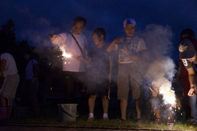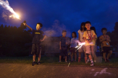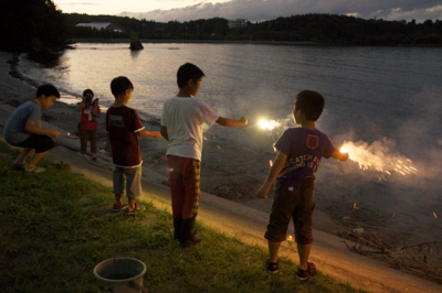 さて、7時になったら、花火へ。歩いて5分ほどの海岸へ行って、みんなで花火大会(^_^) グループリーダーに花火セットを渡して、あとは、ケンカにならないように分けてね。最後は、高校生ボランティアのお兄さんにお願いして、打ち上げ花火をしてもらいました。 1時間ほどの花火が終わると、8時からお風呂タイム。お風呂からでたら、自由時間〜9時半消灯までは走り回ったり、話をしたり、UNOをしたりとそれぞれの時間を過ごしていました。