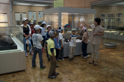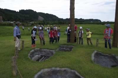 バスが着いたのは、真脇遺跡縄文館。北陸最大級の縄文時代の遺跡です。縄文館の中を施設の方に案内してもらい、イルカなど骨や様々な土器、木製品などの展示品を見学しました。外にでて遺跡の発掘現場の近くまで行ったりして、ここに縄文時代から人が住んでいたなんて、ちょっと不思議...って体験をしました。