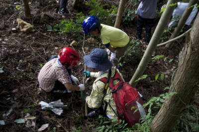 のときんぷらでこの2日間の簡単なオリエンテーションをして、1つ目のプログラム、アカテガニ観察に出発! 出発直後から、カニがいた?ような横穴を発見! 棒で掘りはじめていきなり時間がかかりそう(^_^; これから海沿いへ行けば、いくらでもいるよ〜と声をかけながら先頭に遅れないようについて行きました...