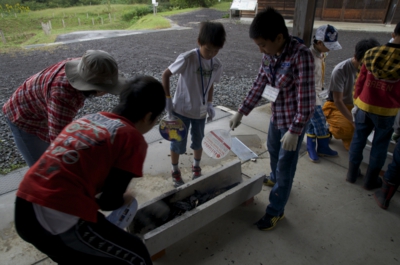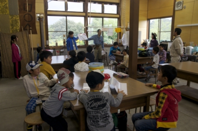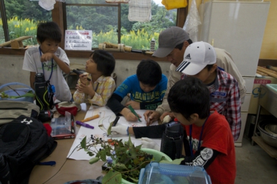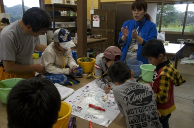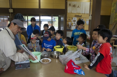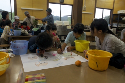 まずは、夕日寺健民自然園の中の探検です。食べられるものはどんなものがあるかな? 小1時間ほど、いつもの自然園の中を「食べられもの」を中心によ〜く見ながら歩きました。ソバ、ダイコン、カブ、サツマイモ、トウガラシ、イチジク、カキ、クリなどがみつかりました。 体験工房へかえってくると、グループごとにどこで何があったか、地図を作って発表会。こうしてみると、いろいろなものがあるのが分かります。