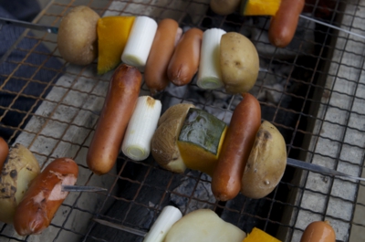 火がついたら、自分で食べたい具材を刺した串焼き