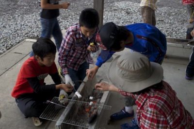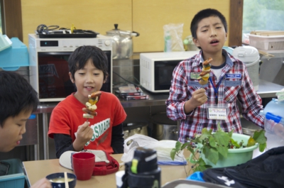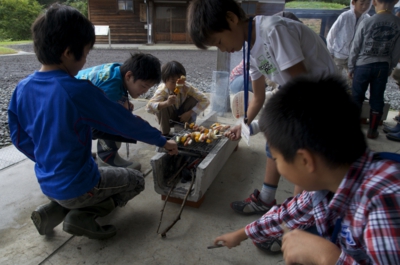 そのあとは、お昼ご飯のために火をおこします。火が起きないとお昼ご飯が食べられないかも(^_^; U字抗と炭、着火剤をつくって、あとはパタパタうちわをあおぐけど、なかなかうまくいかない... なんかとか火がおきたら、今日のお昼ご飯の用意。ウインナーやジャガイモ、カボチャ、長ネギを串に刺して、炭火で焼いたらできあがり。持ってきたおにぎりを焼く子もいる(^_^)